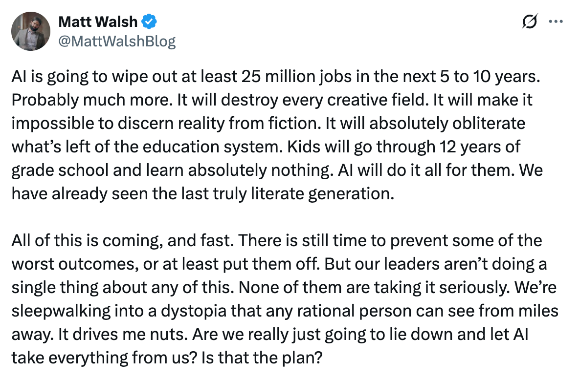 Matt Walsh, someone I disagree with on basically everything (especially this), posted about how AI will erase millions of jobs, how nobody is looking out for regular people and the country isn’t ready for the shockwaves that are coming.