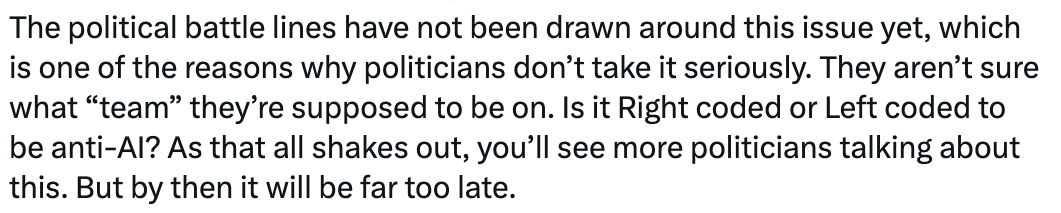 Democrats have been talking about inequality for years but have no message for what AI means for real people. You see nibbling on the edges: Kamala Harris urges AI companies to consider trust and empathy... Richard Blumenthal warns about AI in toys for Christmas.