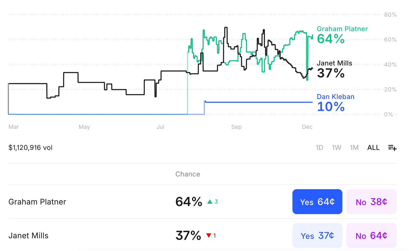 Then there’s Graham Platner, who as of now on Kalshi has a 64% chance of winning the Democratic nomination for Senate in Maine. He’s a veteran who sells oysters and films raw videos around rural Maine, and he suddenly emerged in the national political conversation because Mainers are flocking to his events, standing by him as attacks come from the Maine governor (his primary opponent) and Chuck Schumer in DC.